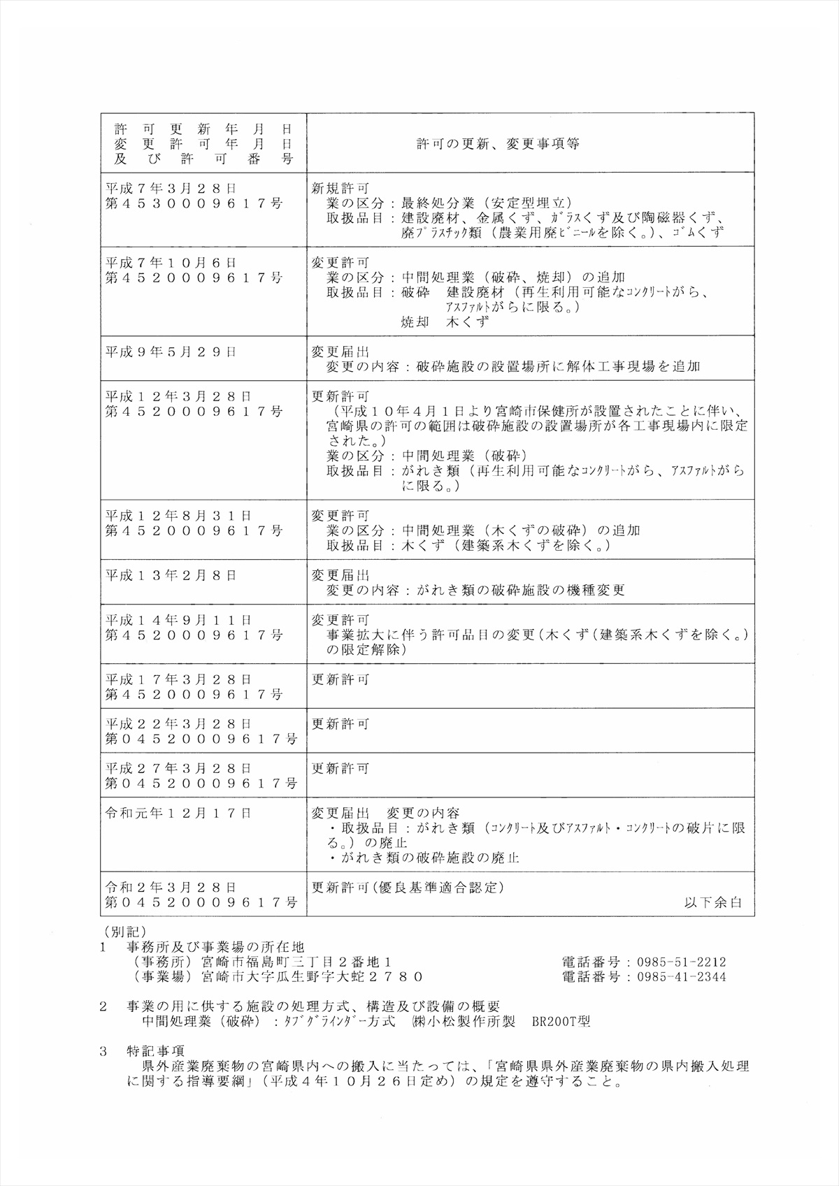 (2) 事業の透明性 : 法人の基礎情報、取得した産業廃棄物処理業等の許可の内容、廃棄物処理施設の能力や維持管理状況、産業廃棄物の処理状況等の情報を、一定期間継続してインターネットを利用する方法により公表し、かつ、所定の頻度で更新していること。