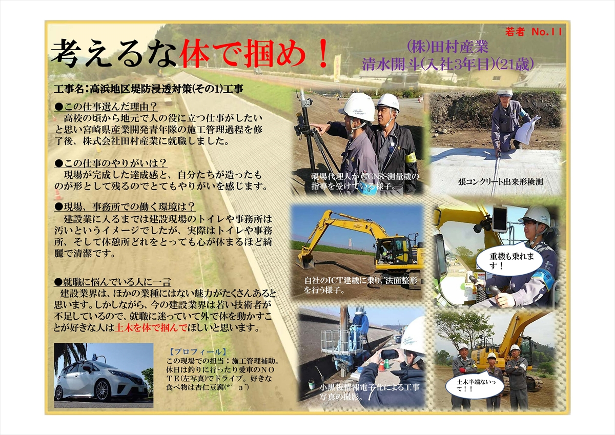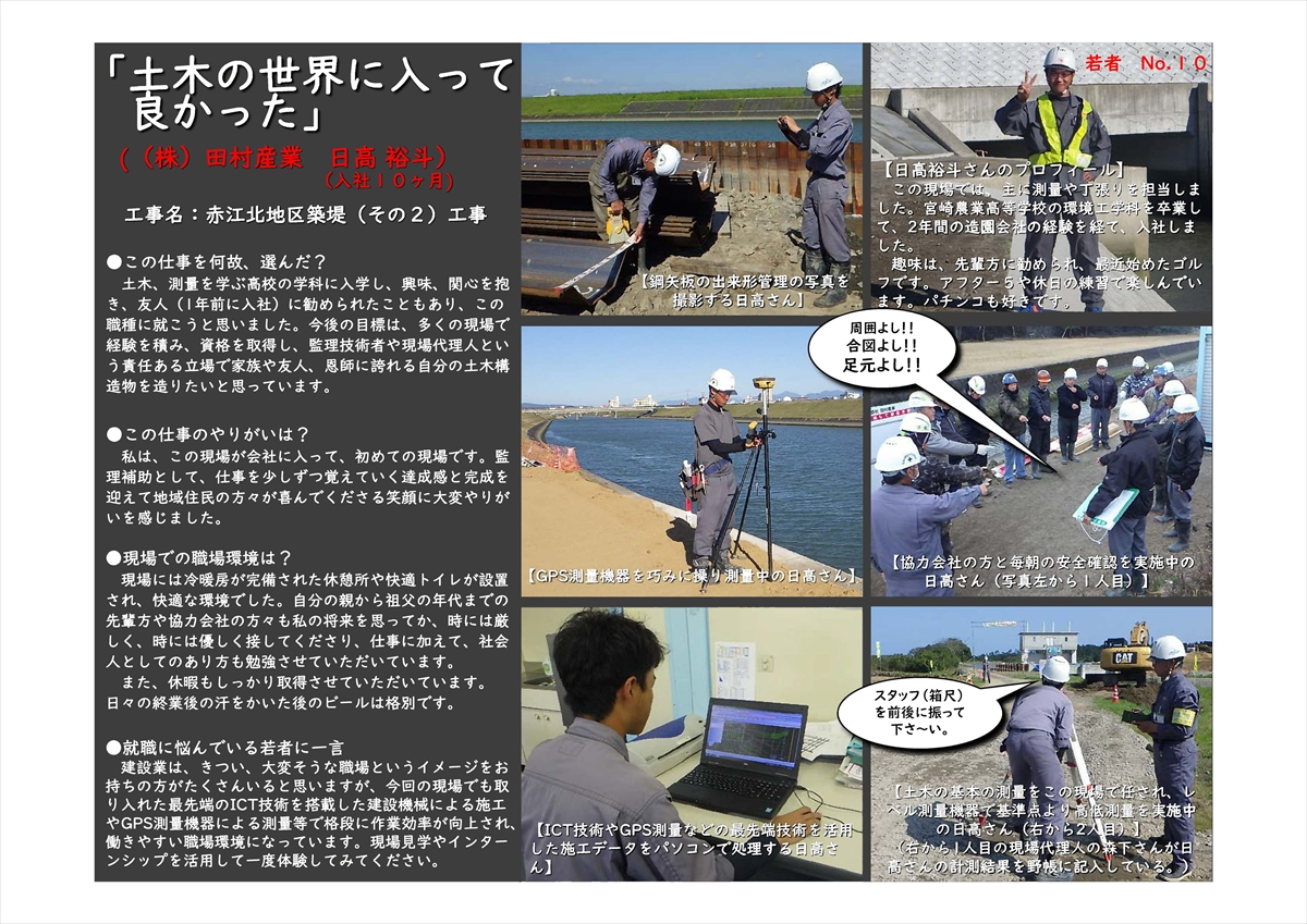 国土交通省 九州地方整備局 宮崎河川国道事務所のホームページやフェイスブック等で、『地域を支える技術者たち』として、弊社の若手技術者(2名)が紹介されました。